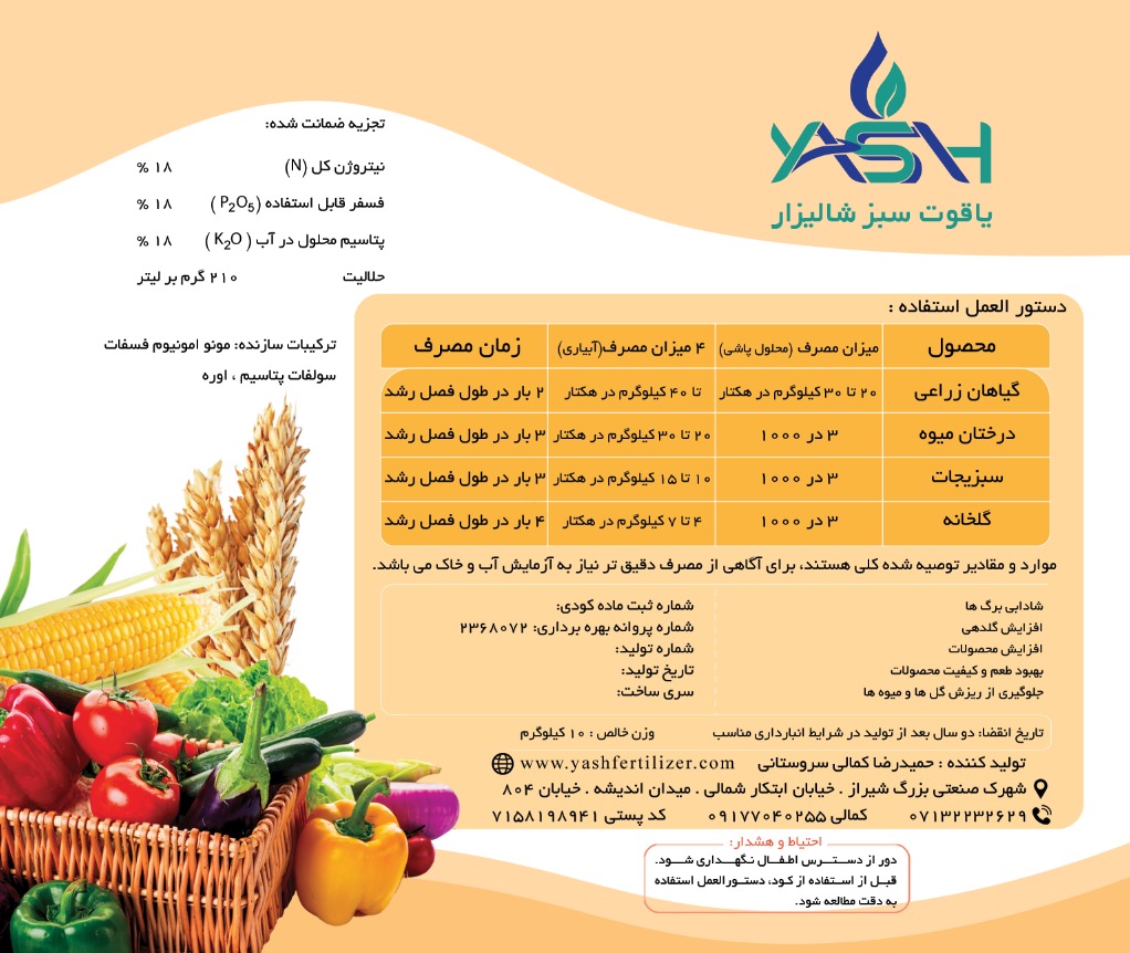 این کود دارای ۱۸ درصد از عناصر نیتروژن، فسفر و پتاسیم می باشد و از آنجا که این سه عنصر در کنار هم نقش بسار موثری در تناسب ارشد گیاه و تغذیه مناسب جهت افزایش رشد طولی و رشد ریشه جوانه زنی و میوه دهی و افزایش کیفیت محصولات زراعی را دارد.